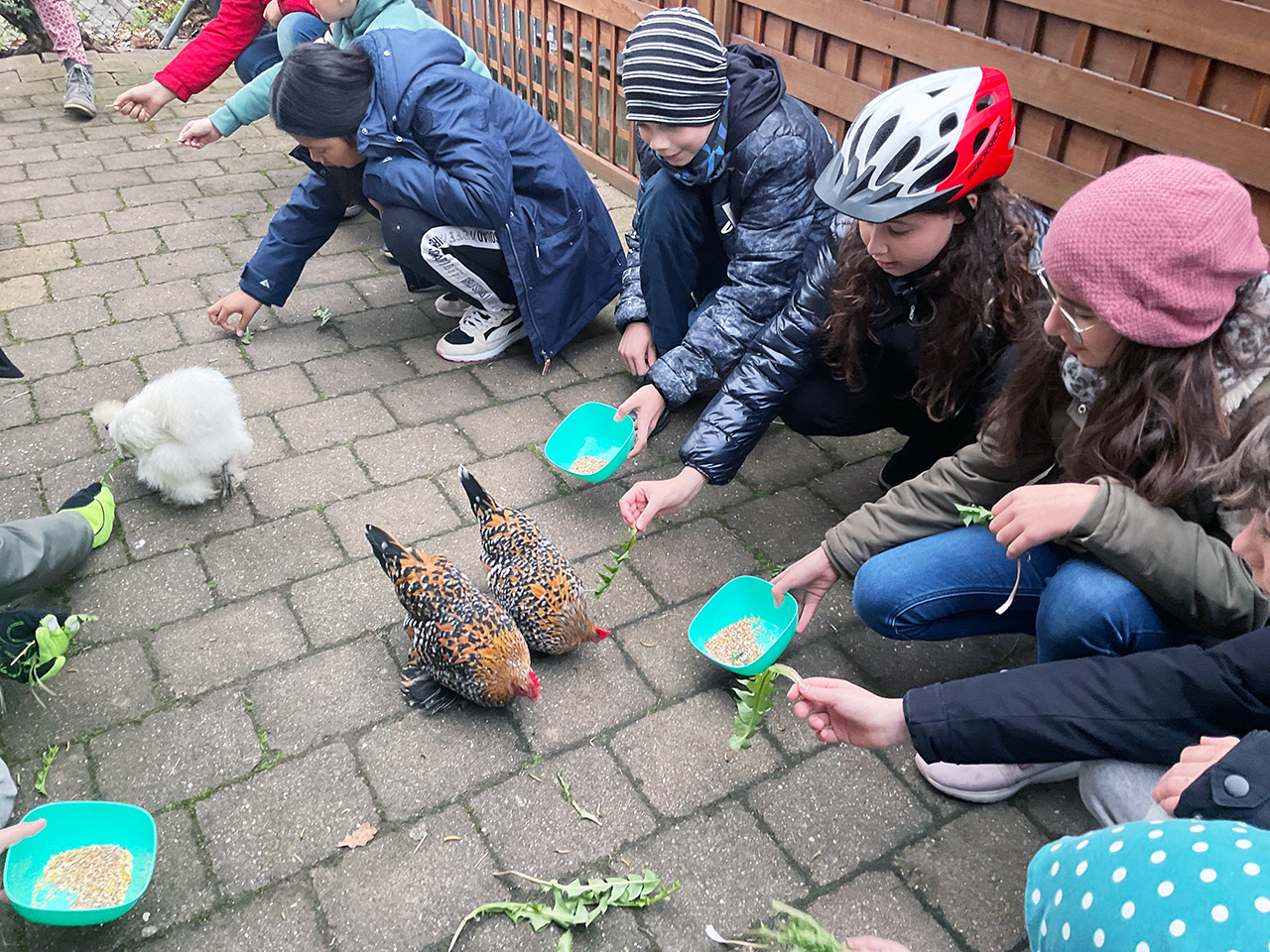 Es freute uns sehr, dass die Hühner sich sogar mit der Hand füttern ließen und ganz viele von uns fütterten sie mit Löwenzahn, Gras und Mehlwürmern.