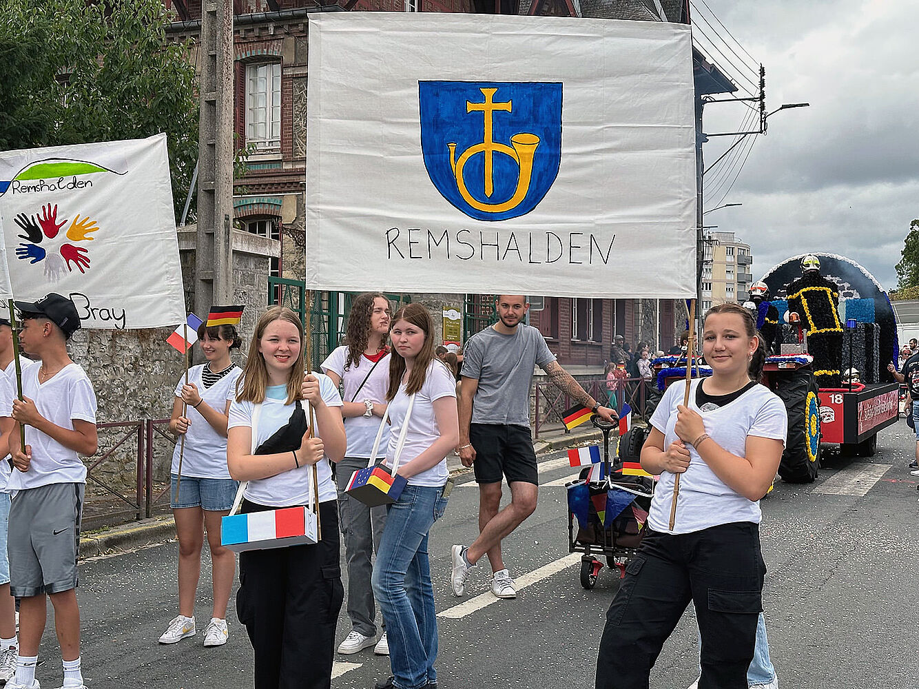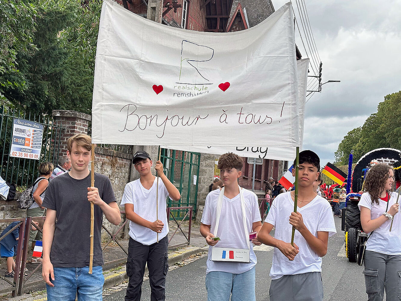 Der große Tag des Festumzugs am Sonntag stand an und wir Remshaldener durften mit Flaggen und Süßigkeiten daran teilnehmen. Das machte mehr Spaß als erwartet und die Franzosen am Straßenrand feierten mit uns. Ein weiteres Highlight war der Besuch am Meer am Montag. Wir mussten mit unserem Bus zunächst 1,5 Stunden nach Dieppe an die Nordsee fahren. Es war ziemlich windig und bewölkt, so dass wir nicht alle so mutig waren, uns ins Meer zu stürzen. Ein Bummel in der Stadt ließ uns das Wetter schnell vergessen.