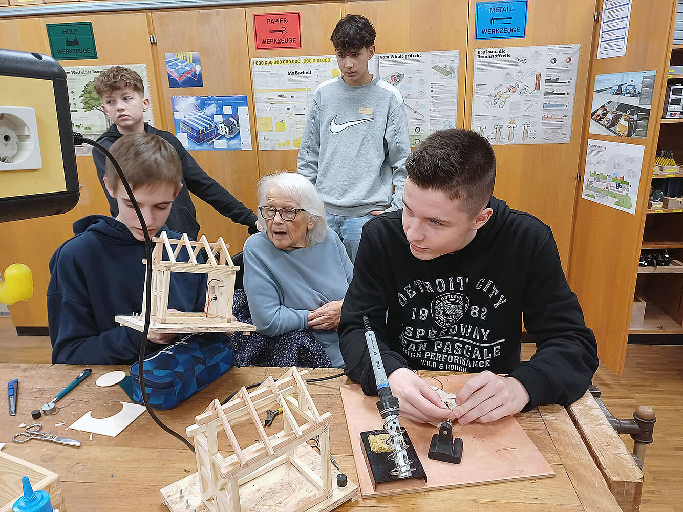 Schnell wurde das Klassenzimmer eine Oase der Gastfreundschaft und die Gäste wurden umsorgt und bewirtet. Nach diesem Informationsaustausch ging es in die große Gesprächsrunde und die Schüler und Schülerinnen stellten im Sitzkreis ihre Gäste vor. Es war sehr spannend das Leben und die Interessen der Seniorinnen zu erfahren. Anschließend strömten die Schüler mit ihren Gästen aus, um das moderne Schulhaus zu zeigen. Ob Technikraum, Küche, Computerraum oder Musiksaal, alles wurde interessiert betrachtet und das Highlight war, die Lehrer und Schüler spontan im Unterrichtsgeschehen zu erleben und kurz ins Gespräch zu kommen. Auch die Klassen ließen sich gerne „stören“ und winkten den Besuchern freundlich zu. Ein Gang zum Sekretariat und Rektorat ließ man sich nicht entgehen, auch dort wurde man willkommen geheißen.