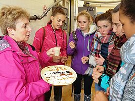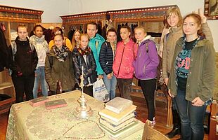 Am Mittwoch war der obligatorische Empfang im Rathaus und anschließend wurden alle zum Pizzaessen eingeladen. Etwa 1 km außerhalb von Étyek befindet sich „Étyek tej ödön-Major“, ein landwirtschaftlicher Großbetrieb, der am Donnerstag besichtigt werden konnte, „natürlich“ wieder bei Schlechtwetter. Insgesamt etwa 2500 Rinder, davon werden über 900 Milchkühe gemolken, sind in den riesigen Ställen. Jede Woche werden mehrere Kälber geboren, die in ihren Boxen als „Streichelzoo“ für viel Aufmerksamkeit und Freude sorgten. Überall während der Führung trifft man auf Stolz auf die Leistungen dieses Betriebs bei der Milcherzeugung und der Hochleistungsviehzucht, aber so eine Massentierhaltung ist halt doch nicht jedermanns Sache. Beeindruckend ist aber auf jeden Fall die Selbstvermarktung, zu der auch die Herstellung von verschiedenen Sorten Käse und von Quarkschokoriegeln gehören. Mit einer leckeren Verkostung endete die Führung. Am Freitag stand der Besuch im Heimatmuseum der Étyeker Deutschen auf dem Programm. Ein kleiner Bestand ist nur übrig geblieben, der noch etwas zeigt vom Leben und von der Kultur der Ungarndeutschen, die bis zur Vertreibung im Jahr 1946 die Mehrheit in Edeck, wie das Dorf bis dahin hieß, bildeten. Zum Ausklang gab es eine lebhafte Schulparty von 17 bis 20 Uhr, wo unsere Mädchen mit Ethiker Schülerinnen und Schülern aus allen 5. bis 8. Klassen zusammenkommen konnten.